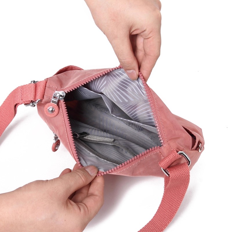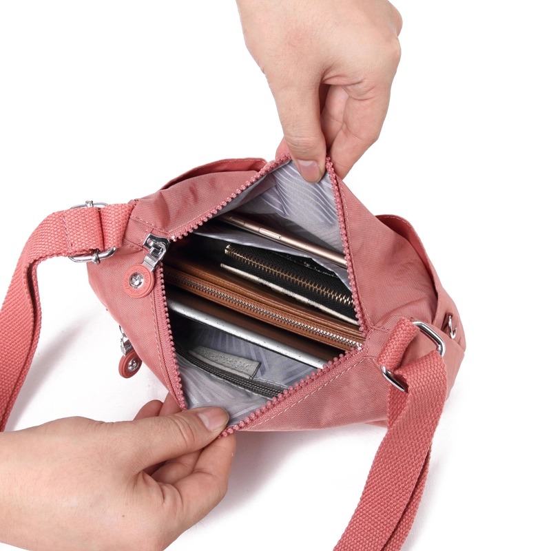 - مدل و تعداد جیب : دارای یک محفظه زیپ دار بالای کیف و دو جیب جلو کیف و یک جیب زیپ دار پشت کیف و دارای آویز جا کلیدی داخل کیف