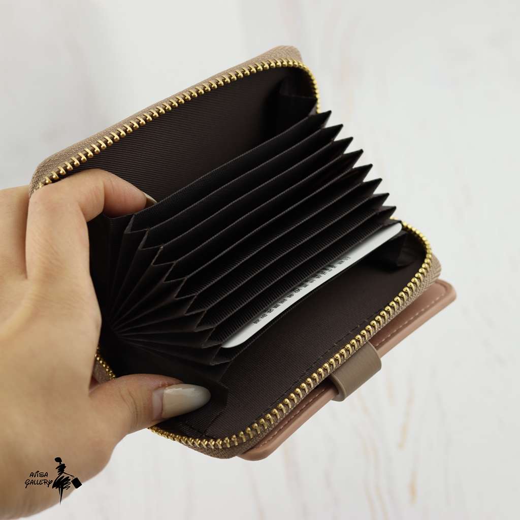 - مدل و تعداد جیب : یک خانه زیپ دار دارای یک جاکارتی آکاردئونی دارای یازده عدد جای کارت و یک قسمت دکمه دار جلوی جاکارتی دارای شش عدد جای کارت